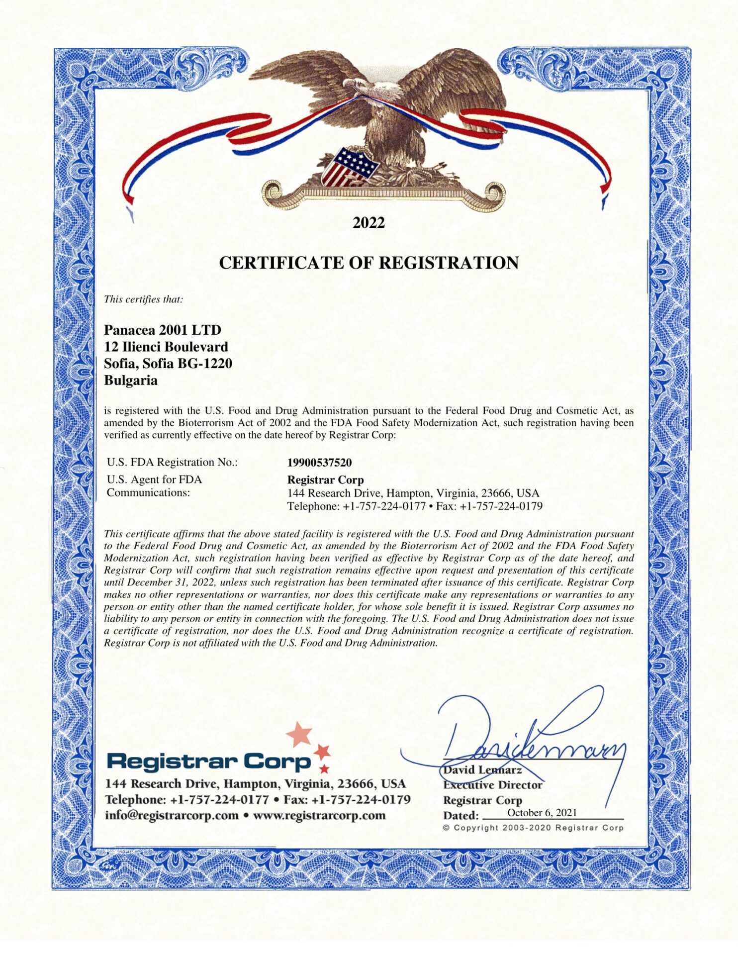 Сертификат за регистрация на “Панацея 2001 ООД” в Американската администрация за храни и лекарства