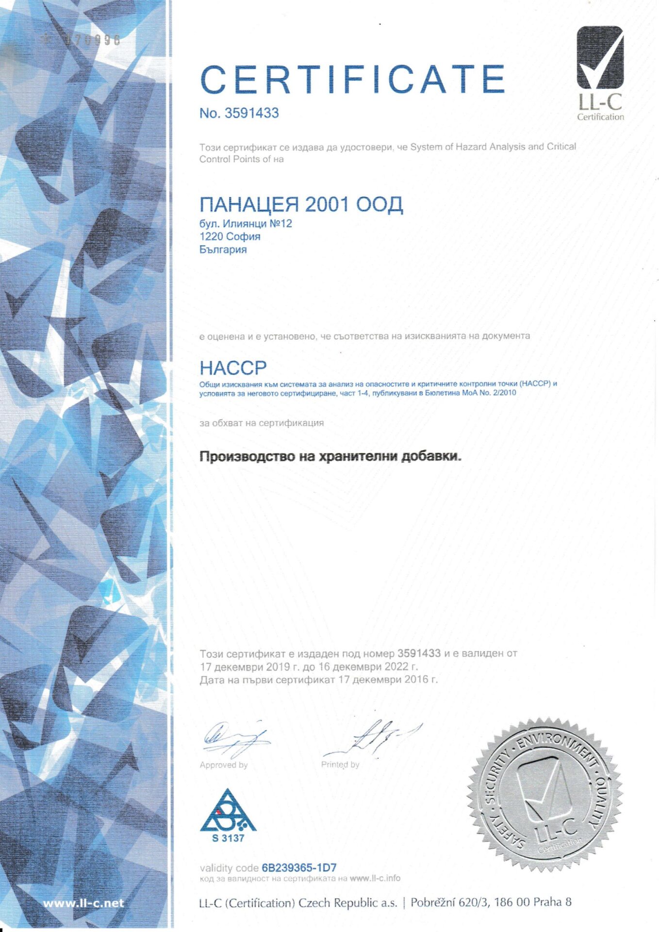 “Панацея 2001 ООД” отговаря на изискванията на документа HASSP за зпроизводство на хранителни добавки.