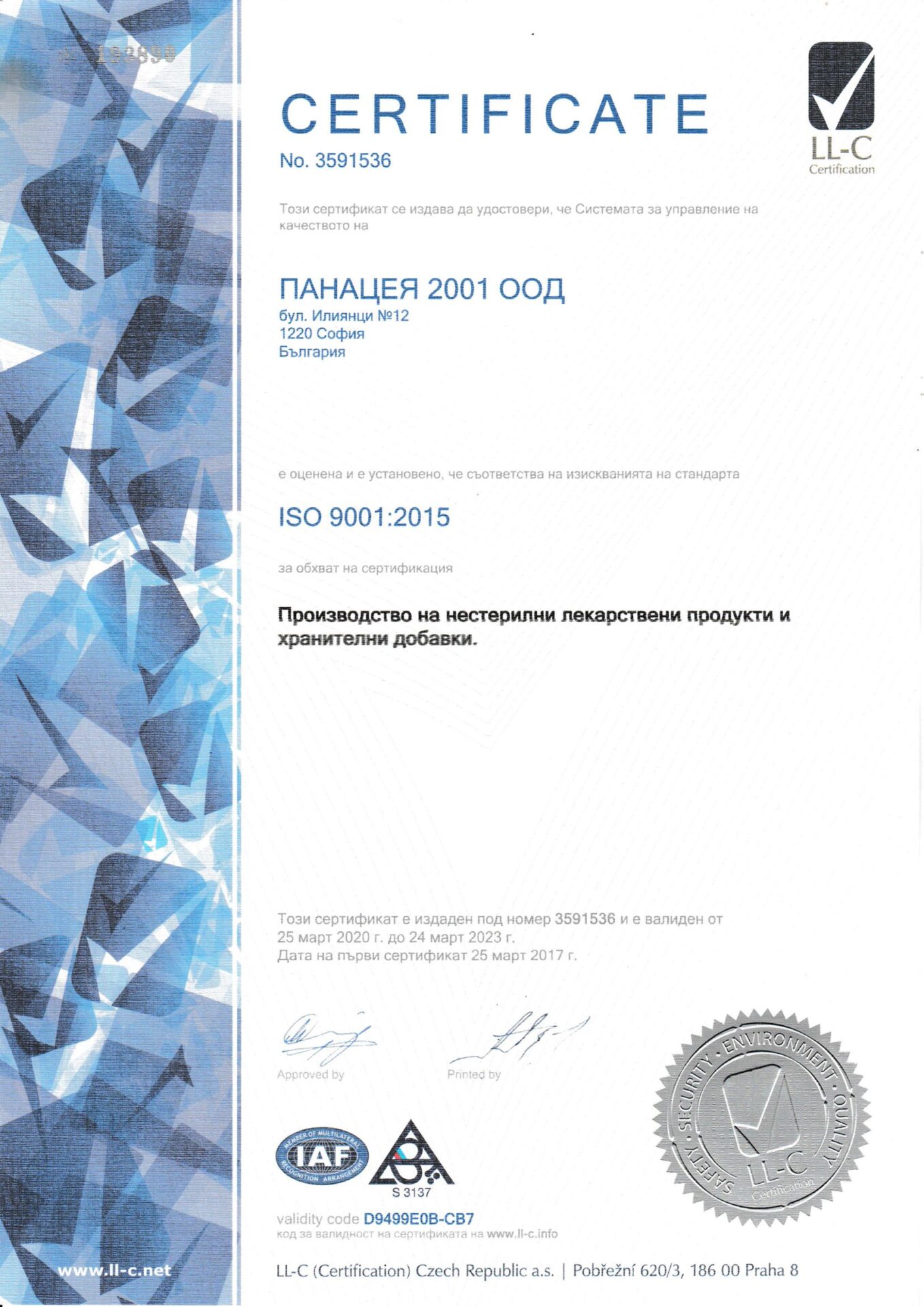 “Панацея 2001 ООД” отговаря на изискванията за качество по ISO 9001:2015
