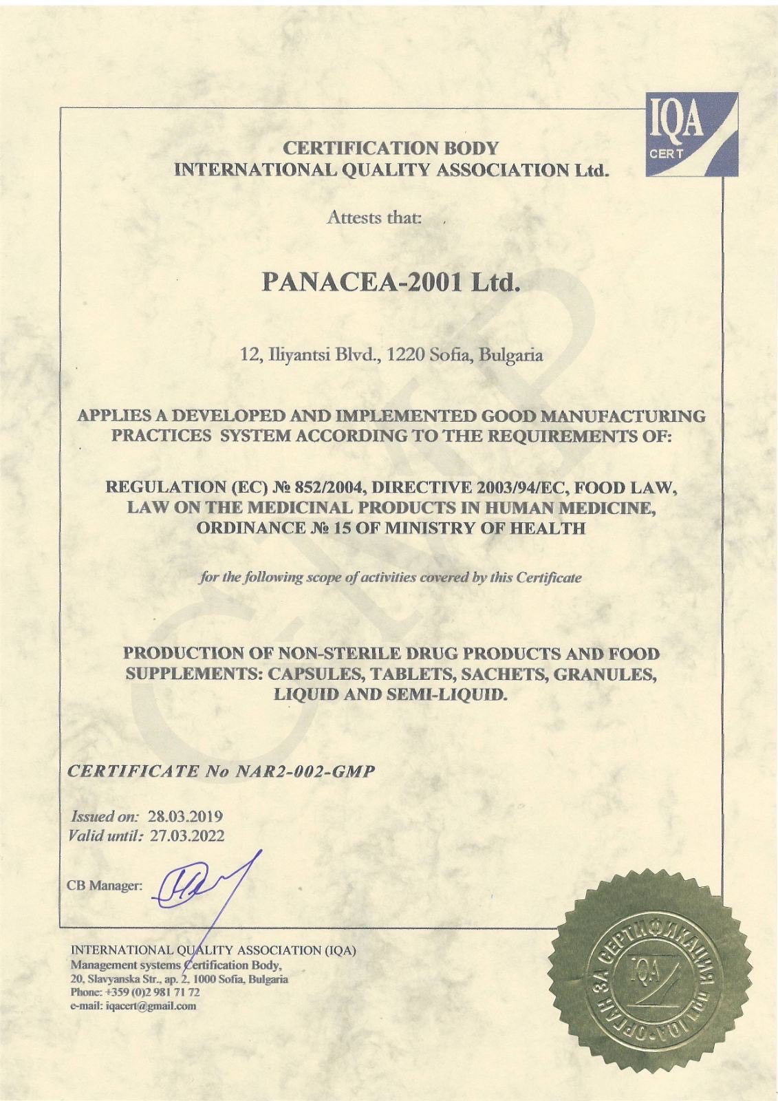 Фирма “Панацея 2001” притежава и следните сертификати: FDA, GMP, ISO и HASSP.